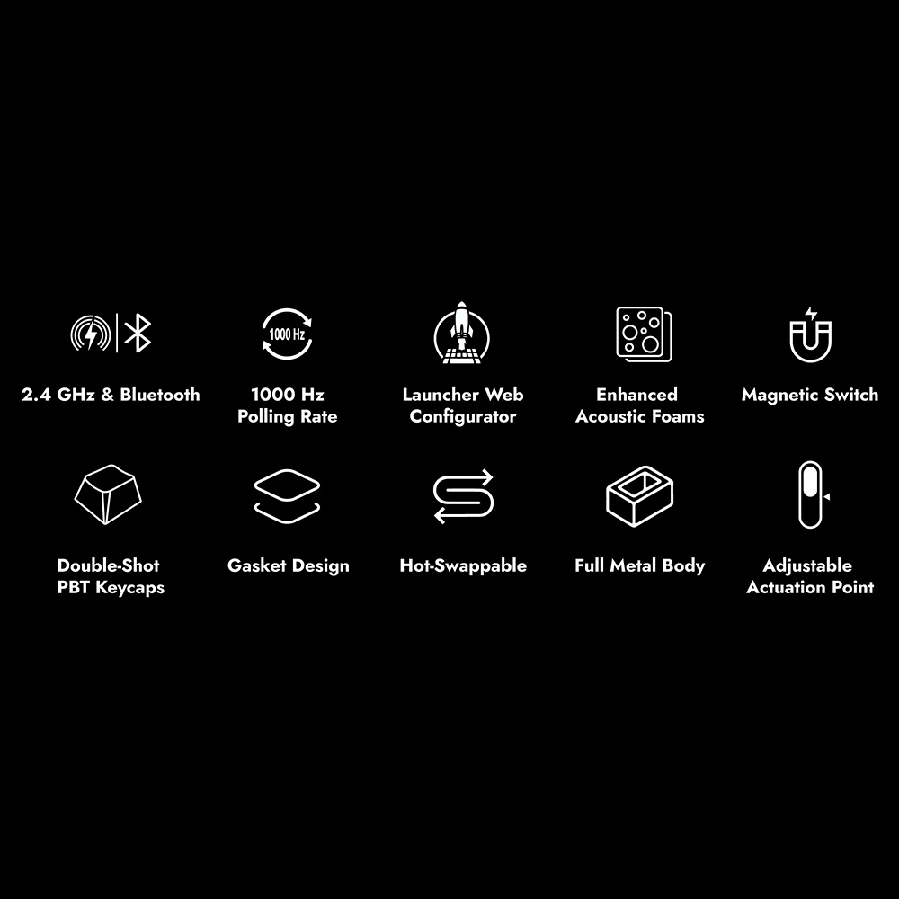 2. Tôi có thể thay thế switch khác cho bàn phím này không? Bàn phím có tính năng Hot-swappable, nhưng nó chỉ tương thích với switch từ tính ray đôi của Gateron (Gateron double-rail magnetic switch). Bạn không thể lắp các loại switch cơ học thông thường (như Cherry MX, Gateron G Pro…) vào bàn phím này do cơ chế hoạt động bằng từ tính khác biệt.