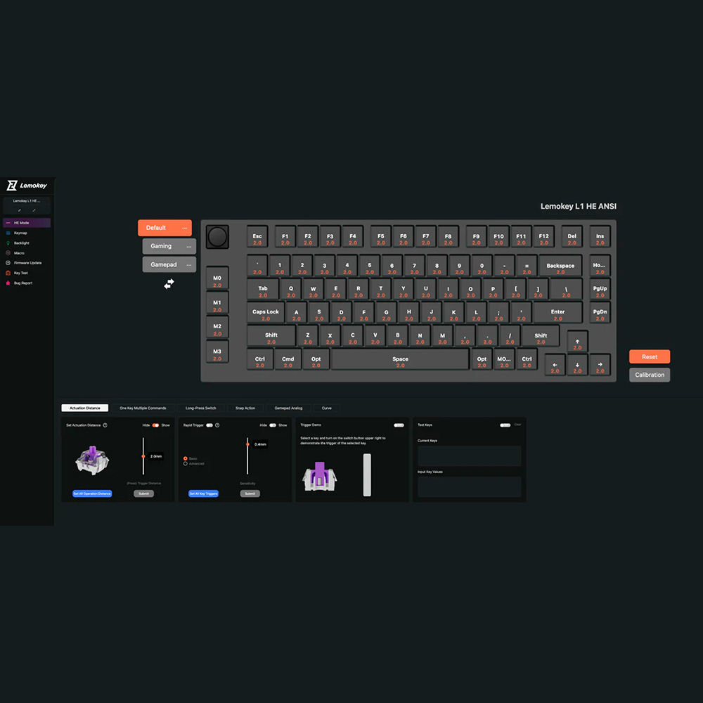 Điểm sáng giá nhất trên Lemokey L1 HE chính là việc trang bị Gateron double-rail magnetic switch, loại switch từ tính mang lại lợi thế tốc độ tuyệt đối cho game thủ. Công nghệ Hall Effect (HE) cho phép người dùng tùy chỉnh điểm kích hoạt (Adjustable Actuation Points) linh hoạt từ 0.2 đến 3.8 mm với độ nhạy cực cao chỉ 0.1 mm, giúp phản hồi thao tác nhanh hơn gấp nhiều lần so với switch cơ học truyền thống. Đặc biệt, tính năng Rapid Trigger cho phép reset phím ngay lập tức khi nhả tay, giúp thực hiện các chuỗi combo kỹ năng siêu tốc trong các tựa game FPS hay Rhythm. Ngoài ra, tính năng Dynamic Keystrokes hỗ trợ gán tới 4 hành động trên một lần nhấn phím (4-in-1 action keys), mở ra khả năng kiểm soát nhân vật ở mức độ thượng thừa.