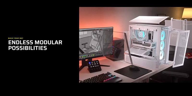 Case máy tính Corsair FRAME 4000D RS ARGB Airflow White CC-9011297-WW mang đến thiết kế modular hoàn toàn, cho phép người dùng dễ dàng tùy chỉnh và nâng cấp theo nhu cầu. Với khả năng thay đổi khay bo mạch chủ, bảng I/O phía trước và nhiều thành phần khác, bạn có thể tạo ra một hệ thống PC độc đáo và phù hợp với sở thích cá nhân. Thiết kế này không chỉ giúp việc lắp ráp trở nên đơn giản hơn mà còn mở ra nhiều khả năng sáng tạo cho người dùng.