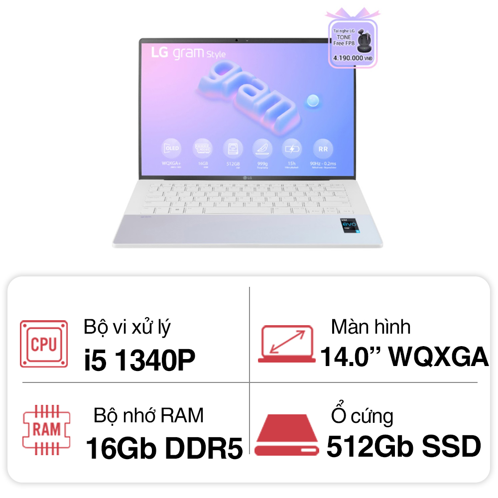 Laptop LG Gram Style 14Z90RS-G.AH54A5 (i5 1340P/ 16GB/ 512GB SSD/ 14 inch WQXGA/ Win11/ White)