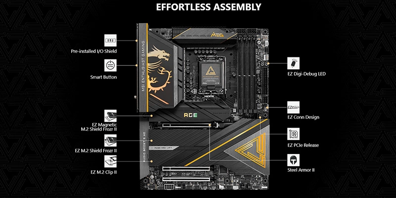 Mainboard PC MSI MEG Z890 ACE được trang bị hệ thống tản nhiệt tiên tiến với heatsink nhôm lớn, ống dẫn nhiệt hiệu quả và Shield Frozr giúp giải nhiệt nhanh chóng cho các linh kiện quan trọng, đặc biệt là khu vực VRM và SSD M.2, đảm bảo hệ thống luôn hoạt động ổn định ở hiệu suất cao mà vẫn êm ái.