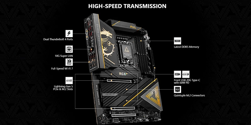 MSI MEG Z890 ACE mang đến khả năng kết nối siêu tốc với 2 cổng Thunderbolt™ 4 hỗ trợ DisplayPort™ 1.4, cùng nhiều cổng USB 3.2 Gen 2×2 Type-C®. Chuẩn WiFi 7 mới nhất đảm bảo tốc độ kết nối internet cực nhanh và ổn định, giúp bạn tải lên và tải xuống dữ liệu lớn một cách dễ dàng.