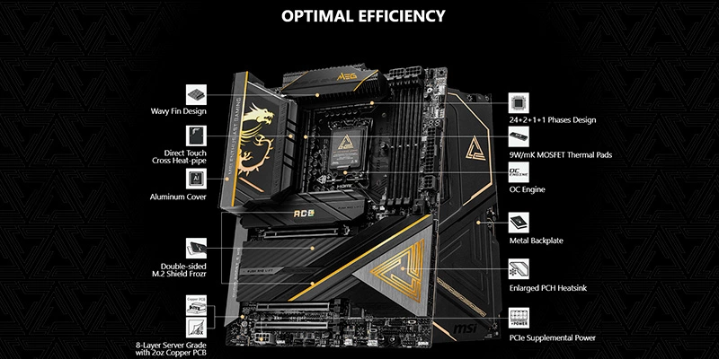 Mainboard PC MSI MEG Z890 ACE sở hữu thiết kế hầm hố với tông màu đen chủ đạo kết hợp cùng các chi tiết màu vàng gold sang trọng, tạo nên vẻ đẹp mạnh mẽ và cá tính. Hệ thống đèn LED RGB Mystic Light cho phép bạn tùy chỉnh hiệu ứng ánh sáng theo ý thích, tạo điểm nhấn cho dàn PC của mình.