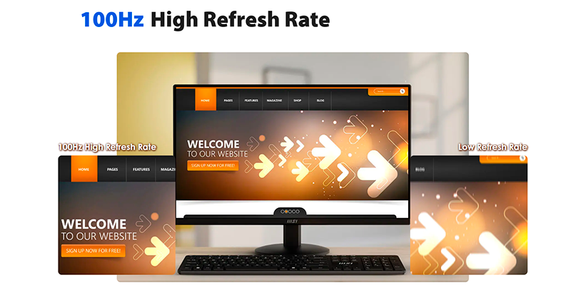 Với tần số quét 100Hz, màn hình hiển thị chuyển động mượt mà hơn nhiều so với chuẩn 60Hz phổ thông, hỗ trợ tốt các thao tác cuộn trang, xem video, làm việc chuyển động và giải trí cơ bản. Thời gian phản hồi nhanh 1ms (MPRT) giảm thiểu hiện tượng bóng mờ và xé hình khi làm việc hay chơi game. Màn hình còn hỗ trợ công nghệ Adaptive-Sync, đồng bộ hóa hình ảnh giữa GPU và màn hình để mang lại trải nghiệm mượt mà hơn.