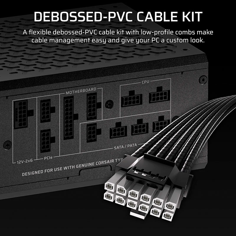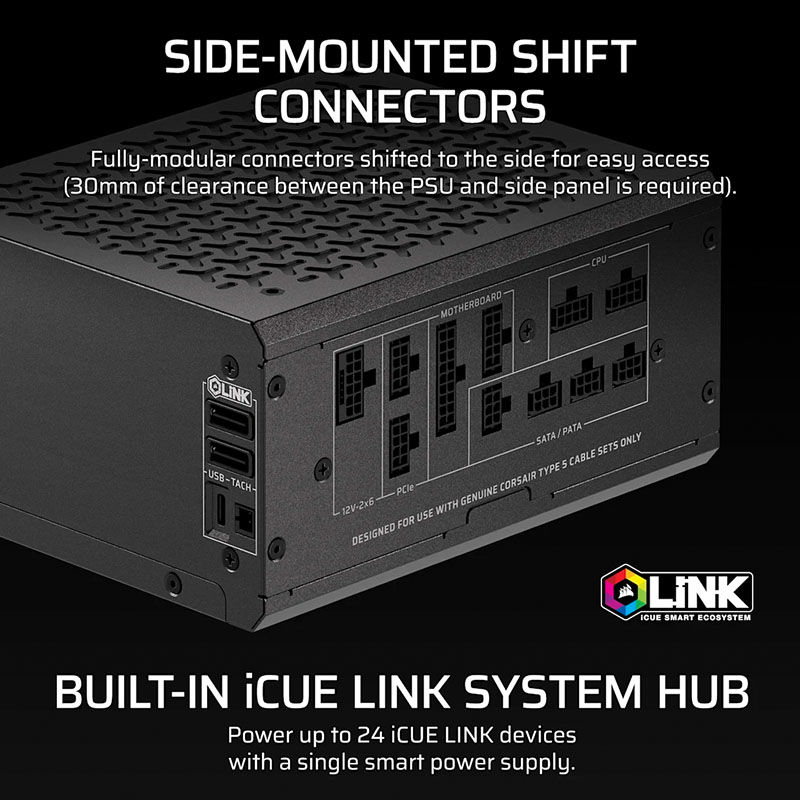 Điểm nổi bật nhất của HX1500i SHIFT nằm ở thiết kế cổng cắm dây nằm bên hông thay vì phía sau, giúp người dùng dễ dàng thao tác khi lắp đặt, đặc biệt trong những case có không gian hẹp hoặc khay nguồn ẩn. Cấu trúc fully modular (toàn bộ dây rời) cho phép tùy chỉnh dây theo nhu cầu, giảm rối và tối ưu luồng khí trong thùng máy. Bộ dây Type 5 mới nhất của Corsair tương thích hoàn hảo với chuẩn ATX 3.1 và PCIe 5.1, đảm bảo tính ổn định, an toàn và truyền tải điện năng hiệu quả cho các linh kiện cao cấp.