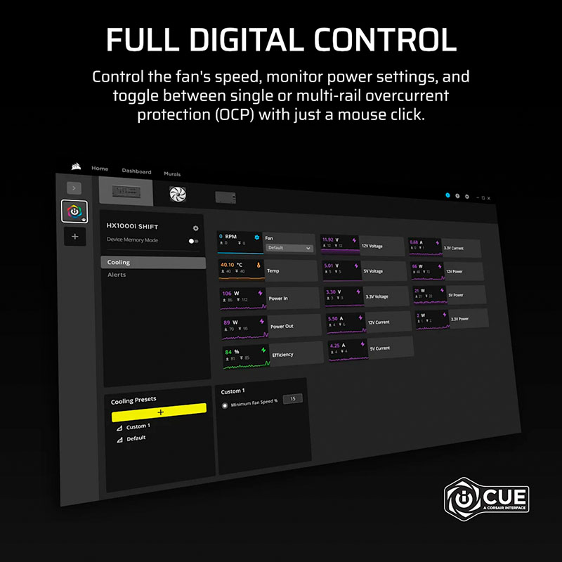 Trang bị Digital Signal Processor (DSP), Corsair HX1500i SHIFT có khả năng giám sát và điều chỉnh điện áp theo thời gian thực, giúp duy trì điện áp đầu ra ổn định ±2%, giảm nhiễu và tăng tuổi thọ linh kiện. Kết hợp cùng phần mềm Corsair iCUE LINK, người dùng có thể theo dõi công suất, hiệu suất, nhiệt độ, tốc độ quạt và điều chỉnh chế độ hoạt động trực tiếp trên PC. Đây là một trong những PSU hiếm hoi tích hợp hệ thống quản lý điện năng kỹ thuật số toàn diện dành cho người dùng chuyên nghiệp.